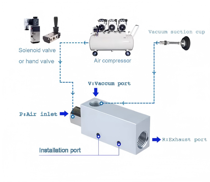 Vacuum generans novum genus efficiens, mundum, oeconomicum, et parvum vacuum componente, quo pressione positiva utitur ad fontem aeris ad pressionem negativam generandam. Inde perfacile ac opportunum est ad pressuram negativam obtinendam in locis aere compressis vel in locis ubi pressiones tam positivae quam negativae in systemate pneumatico requiruntur.