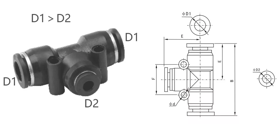 PE conveniens (parem Tee unionem) omnes tres tubos habent eandem exteriorem diameter, idoneam ad connectens tria pneumatic fistulae magnitudine.